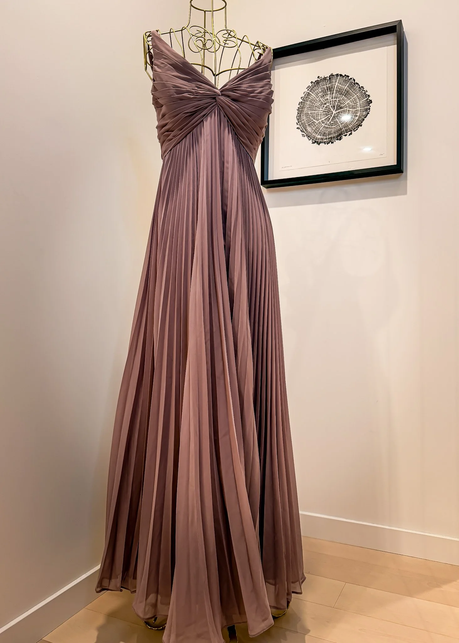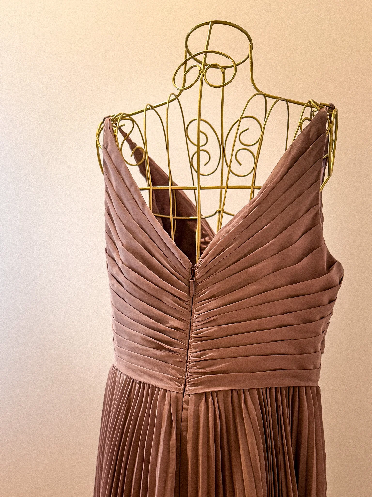 A classic yet versatile dress that features pleats that flatter the body with a fitted bodice and gently flowing skirt for easy movement. Long line perfect for bridesmaids, wedding guests, or formal events—timeless and easy to style.