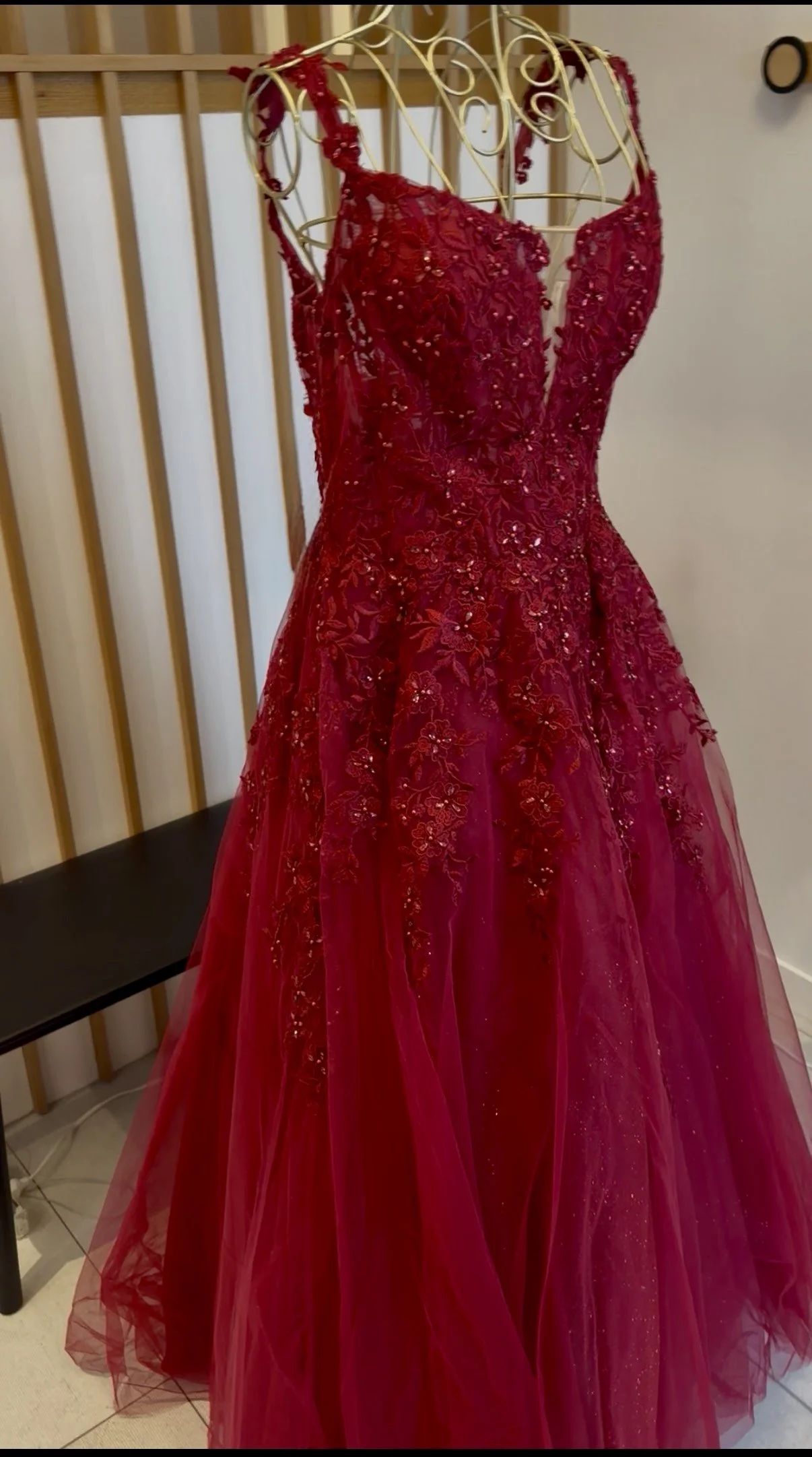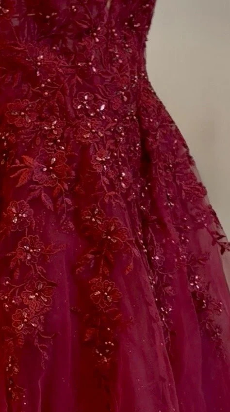 This Ellie Wilde Dress is a dream come true to rent for a formal occasion. Perfect for grad! Wine Red with floral appliqués and a glitter tulle skirt.