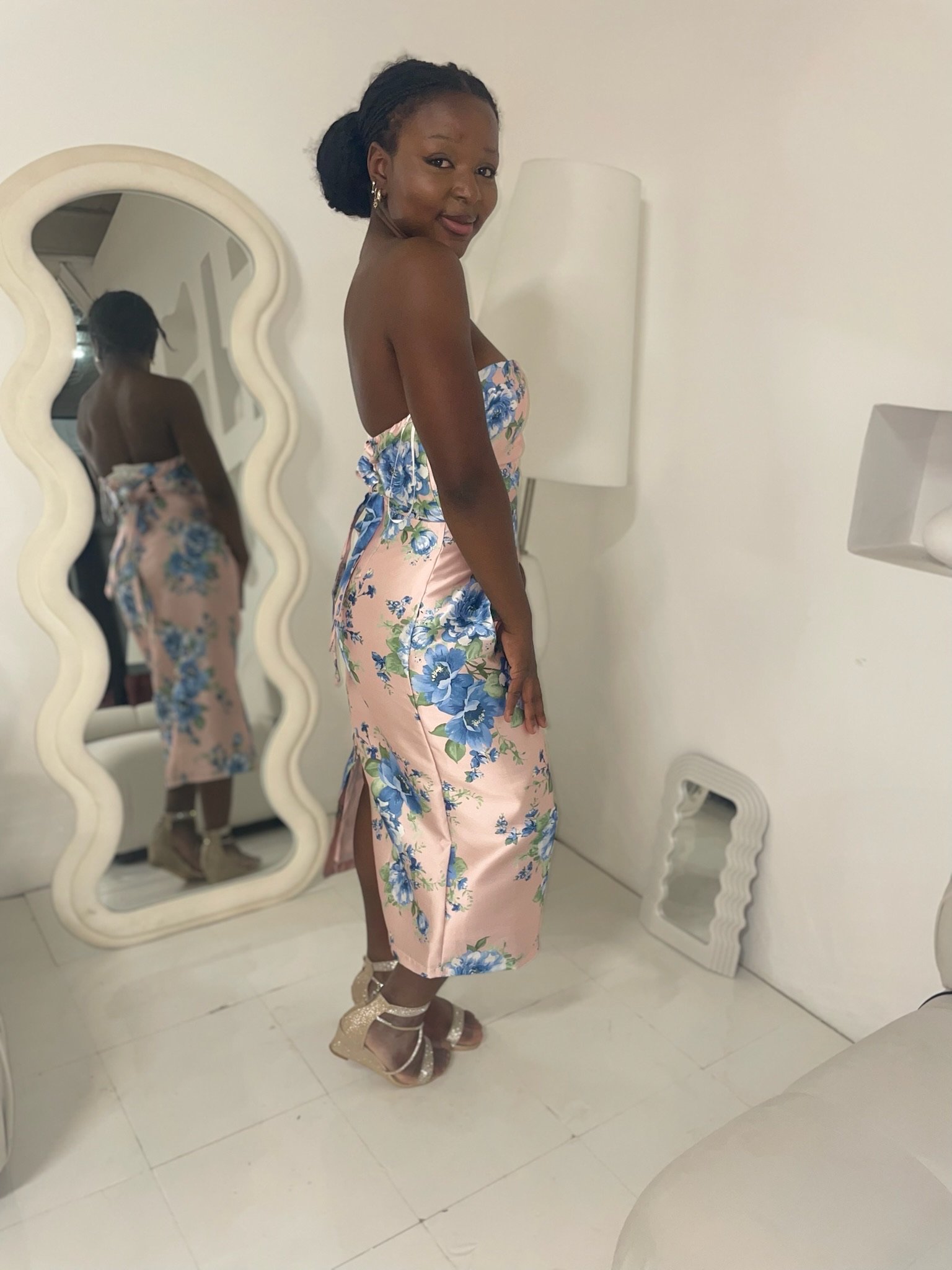 This elegant midi dress is the perfect choice for wedding guests seeking a sophisticated yet comfortable look. Its flattering silhouette and modest length make it suitable for a variety of wedding styles, from garden ceremonies to formal receptions. Available in pink floral with corset back detail this dress pairs effortlessly with classic accessories and provides an effortlessly chic option for celebrating your loved ones’ special day.